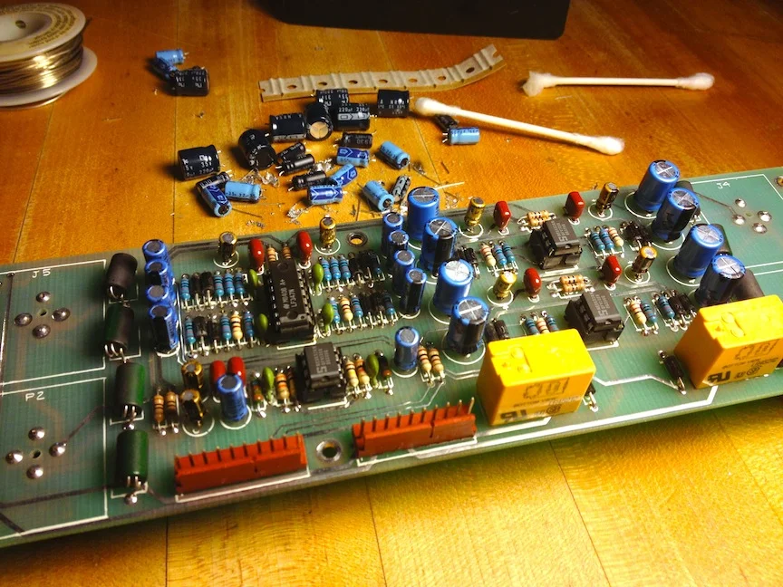 After using this unit for a while I felt like a recap could really help bring the noise floor down a bit and match the response of the left right channels better. Since i was unable to find the original manufacturer or a schematic i took many pictures so i could double check my capacitor orientation and values. One stop at Mouser got me the many caps i would need.